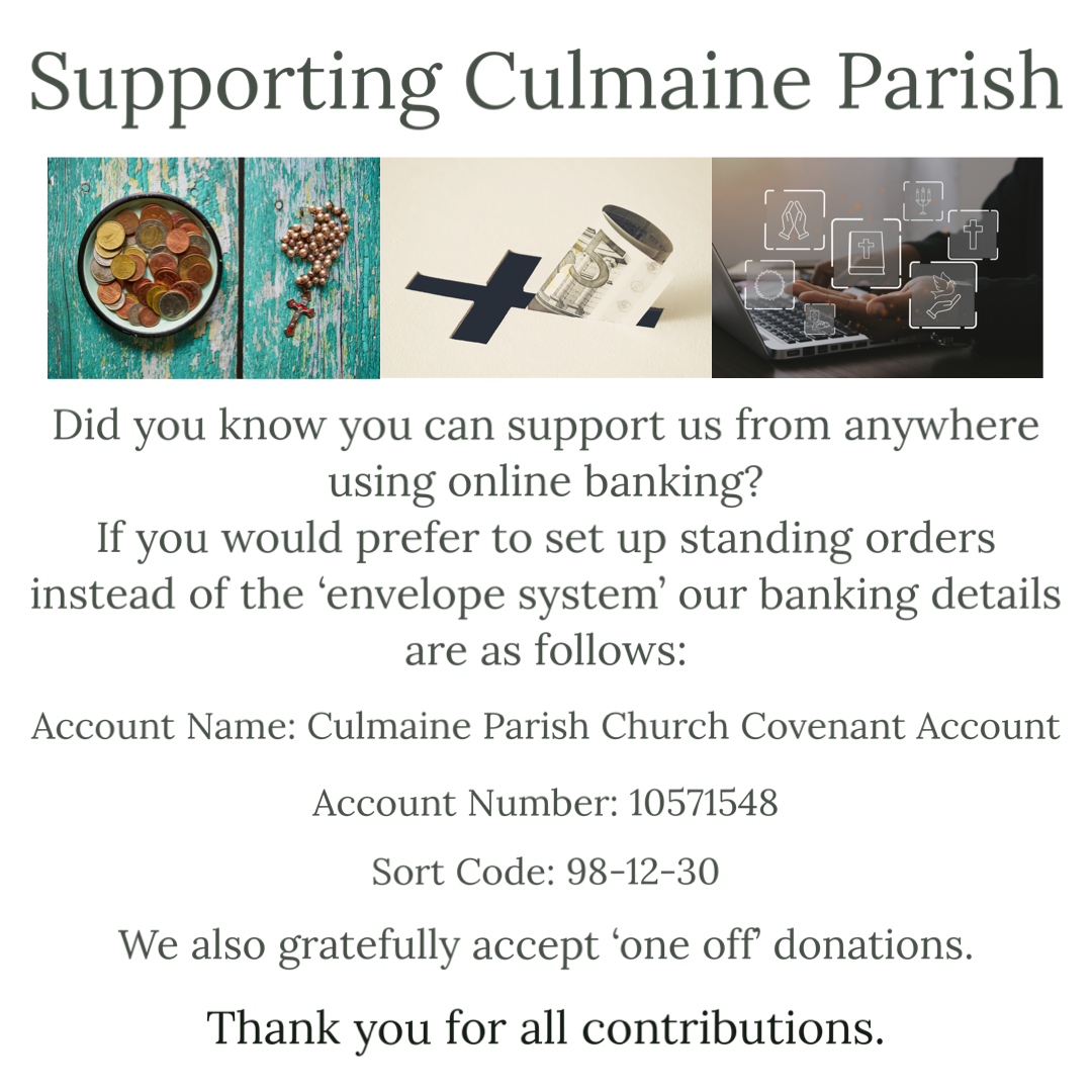 All sterling cheques must be made payable to either Culmaine Parish Church Covenant Account or Culmaine Parish Church Development Account.