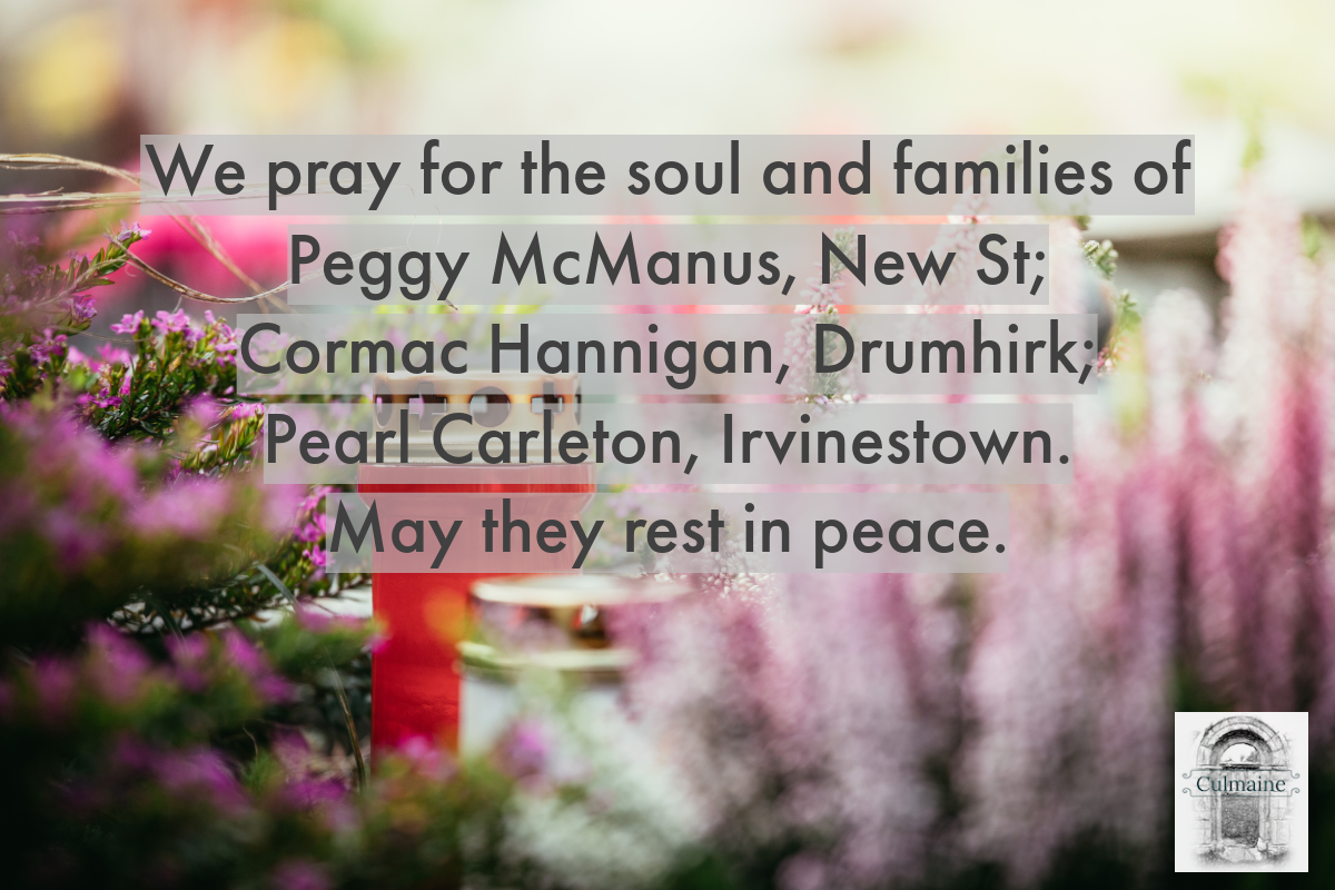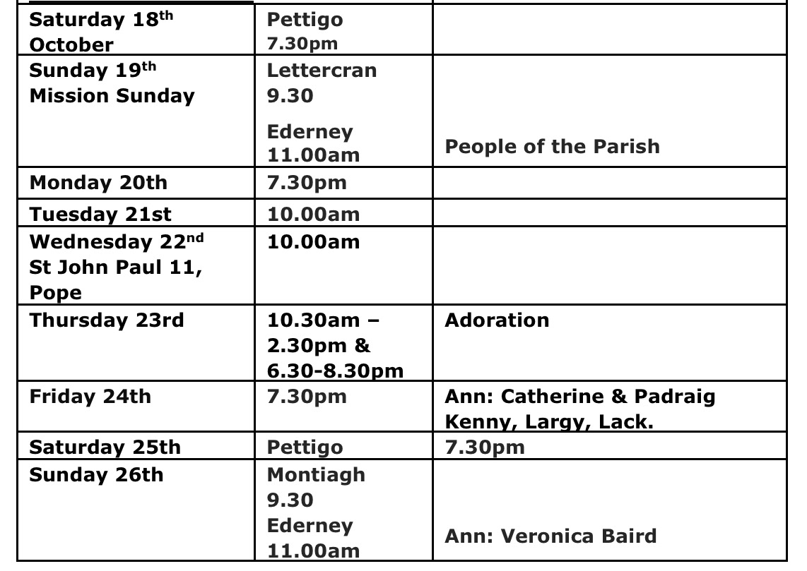 DEVOTIONS: ROSARY AND DIVINE MERCY CHAPLET: Each evening in St Joseph’s Church, Ederney: Sunday – Friday at 6.30pm and on Saturday at 5pm. Everyone is welcome.