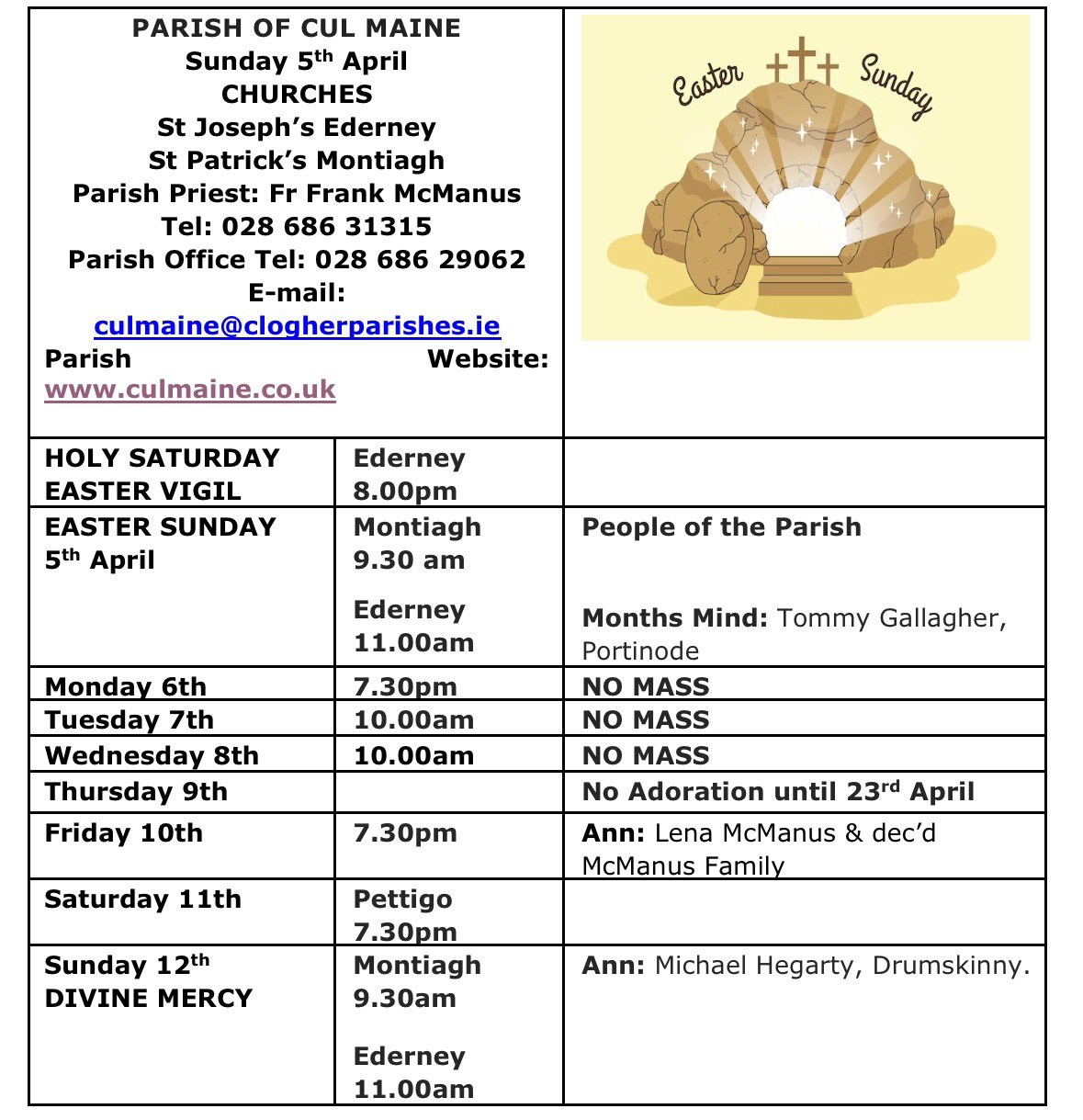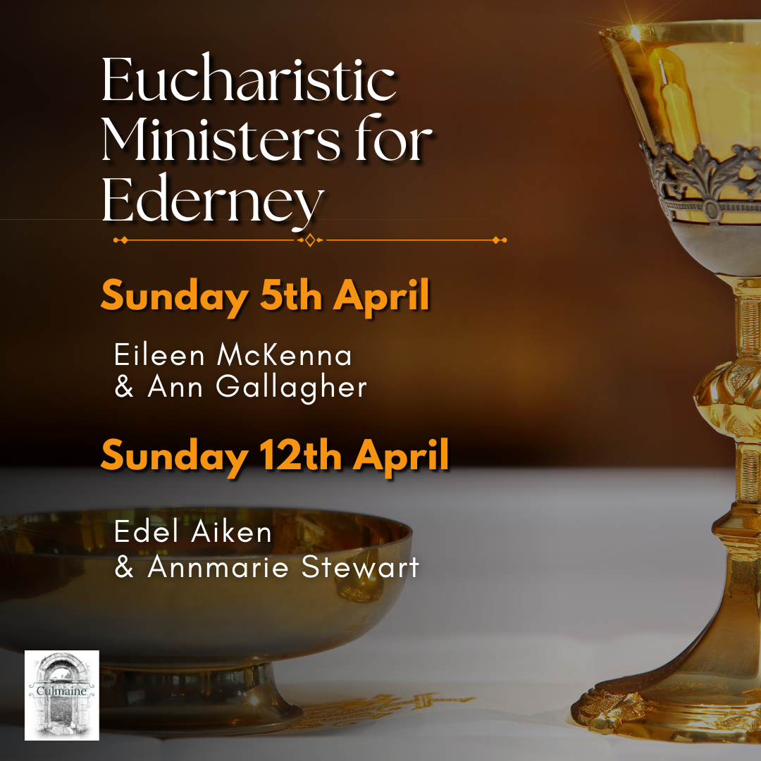 EASTER THANKS: As always Holy and Easter Ceremonies require the work and devotion of many people, and we thank all involved. The Choir, especially Paul, Janette, Liam and all soloists, Parish Liturgy Group, Altar Society and the Flower arrangers (especially those responsible for the Easter Garden); Readers of the Lessons and Prayers of the Faithful, Eucharistic Ministers; Collectors; Ushers; Mass Servers and the Parish Safeguarding Group; young people from the St John Paul Awards Group. We thank especially our sacristans, Eileen Montague & Ann McFarland, and Patsy Monaghan and all who have helped and supported them. Our grounds caretaker for having the front of the Church ready. Those who looked after the gathering of palm for Palm Sunday and those who had the Paschal Fire ready for Holy Saturday night, despite the weather. We pray may the blessing of Easter be yours, now and forever.