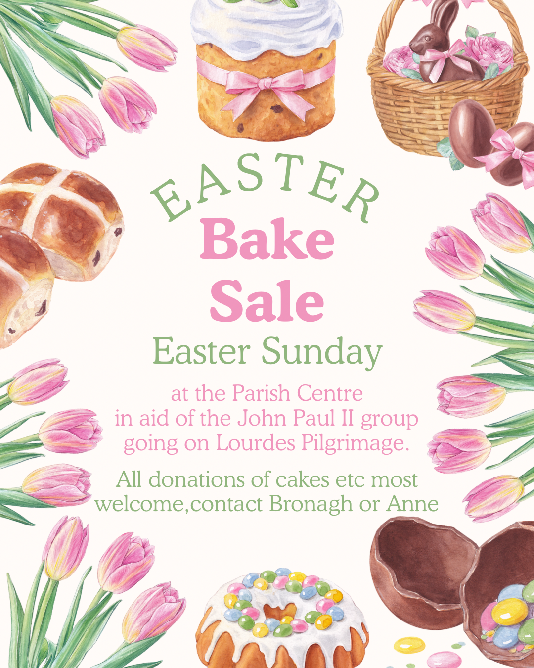 BAKE SALE ON EASTER SUNDAY after 11am Mass in the Parish Centre, proceeds in support of our John Paul Awards students pilgrimage to Lourdes. Lots of lovely Easter Crafts and food treats are available. Please come along and support our young Parishioners who are taking part in the Clogher Diocesan Pilgrimage to Lourdes as helpers.