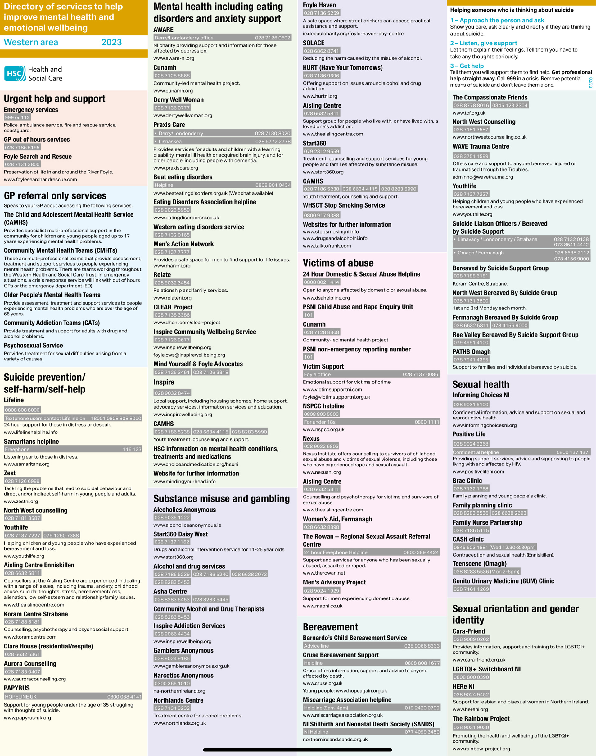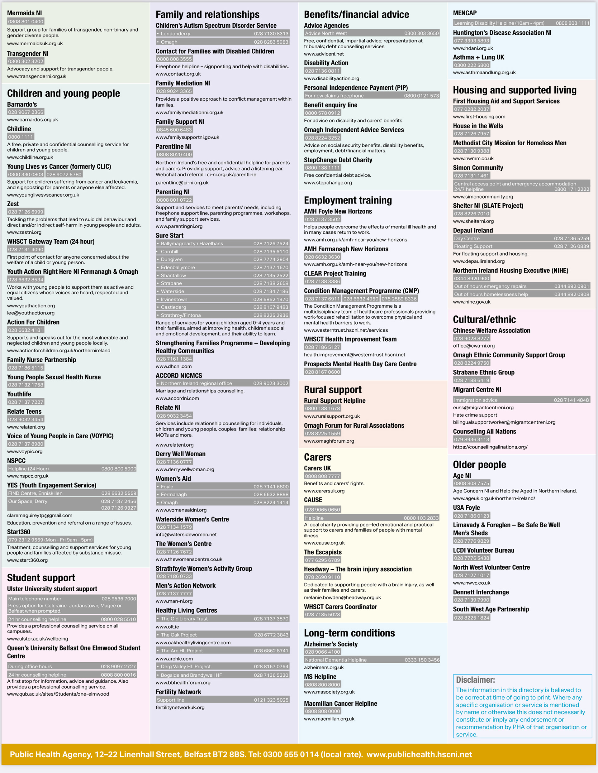 CONNECT FERMANAGH: Don’t feel alone we are here to talk. Phone Connect Fermanagh and we can provide a friendly chat & information /help to link you to the right support & services in your area. We also welcome volunteers from all backgrounds. Calls can be made from the comfort of your own home. Please call 02866320230; info@connectfermnagh.org; www. Connectfermanagh.org